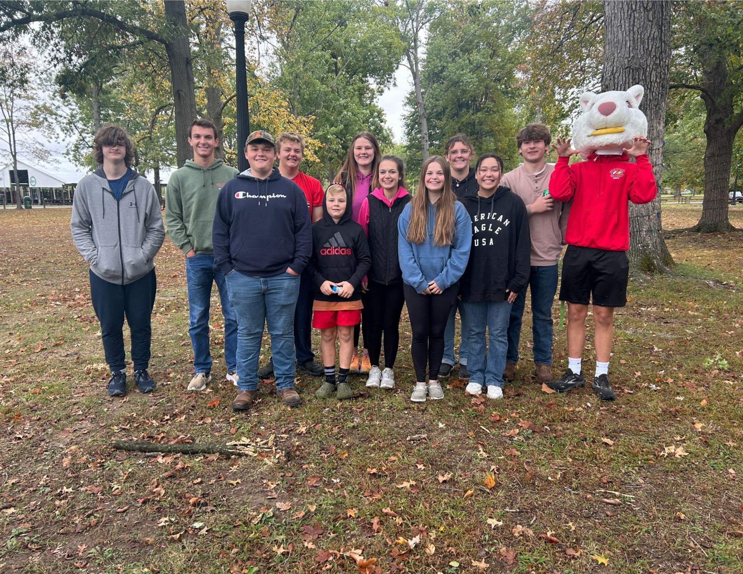 Olney FFA members taking a group picture before splitting up to count the squirrels at the White Squirrel Count. They even got to try on the costume!