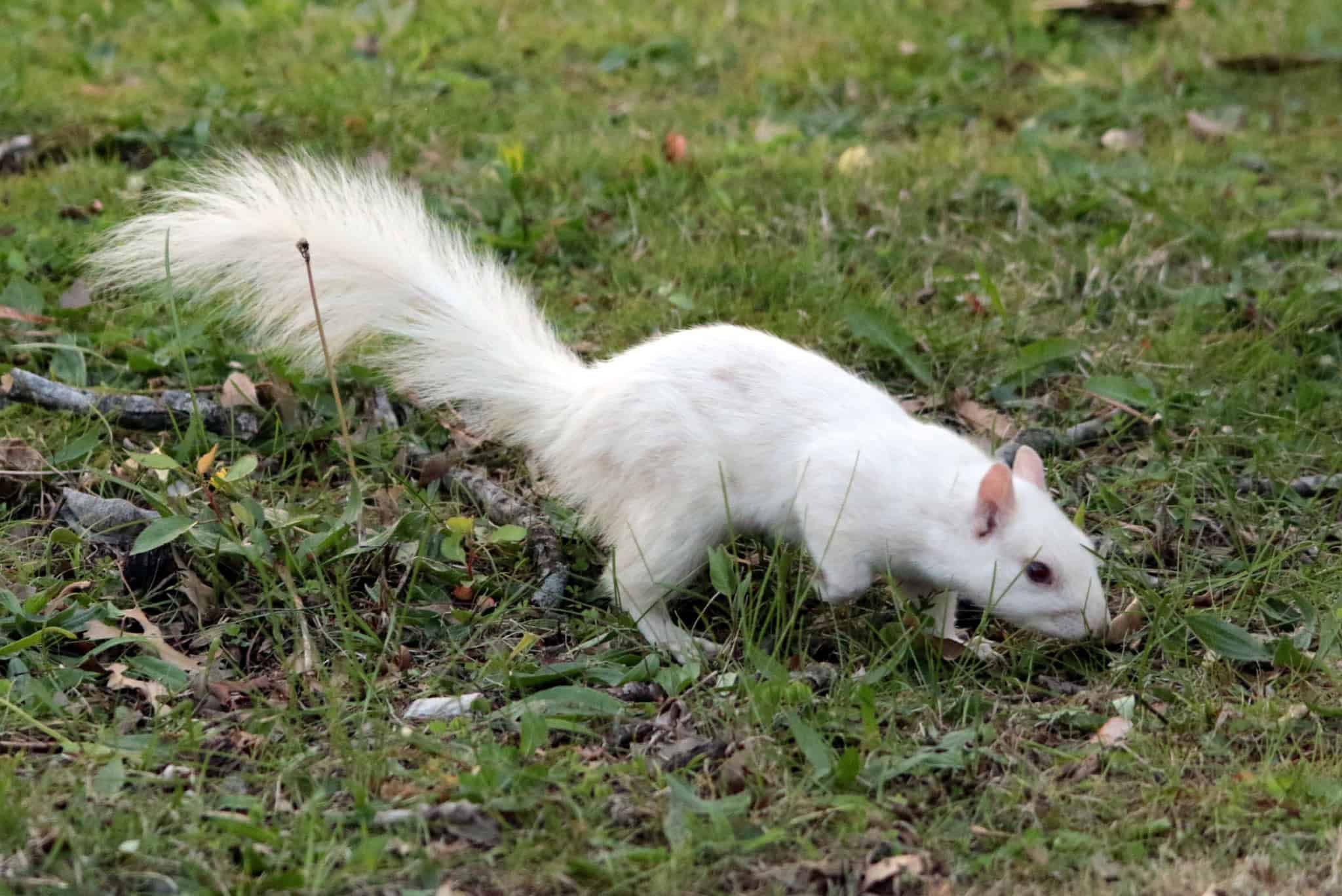 A white squirrel on the prowl for food. Photo taken by Tim Dunahee Photography.